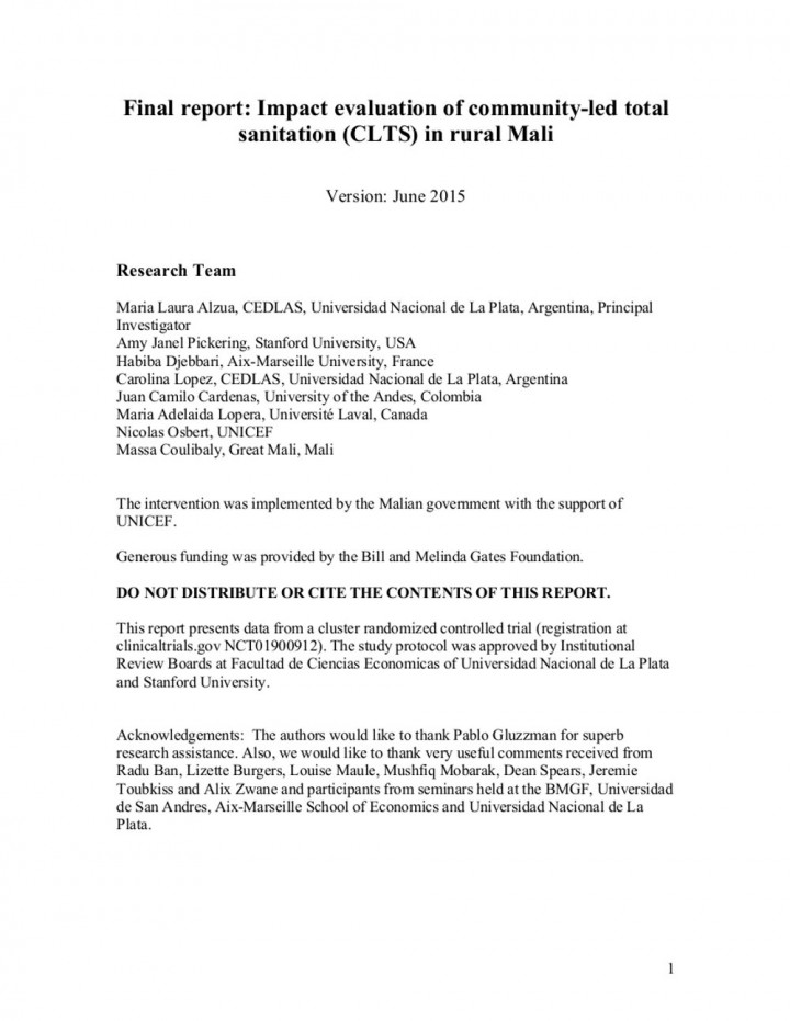 This report covers the main findings of the impact evaluation conducted of a communityled total sanitation (CLTS) campaign implemented by the government of Mali (Direction Nationale de l’Assainissement) with the support of UNICEF. We conducted a clusterrandomized controlled trial among 121 villages randomly selected from the district of Koulikoro in order to evaluate health and non-health …