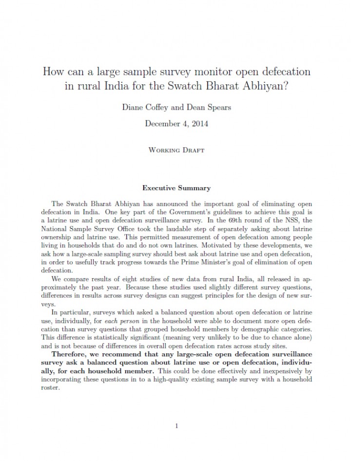 Based on the results, the following recommendations to any organization considering a large-scale, India-wide sample survey to monitor open defecation, latrine use, and progress towards the Swatchh Bharat Mission in rural India are made: