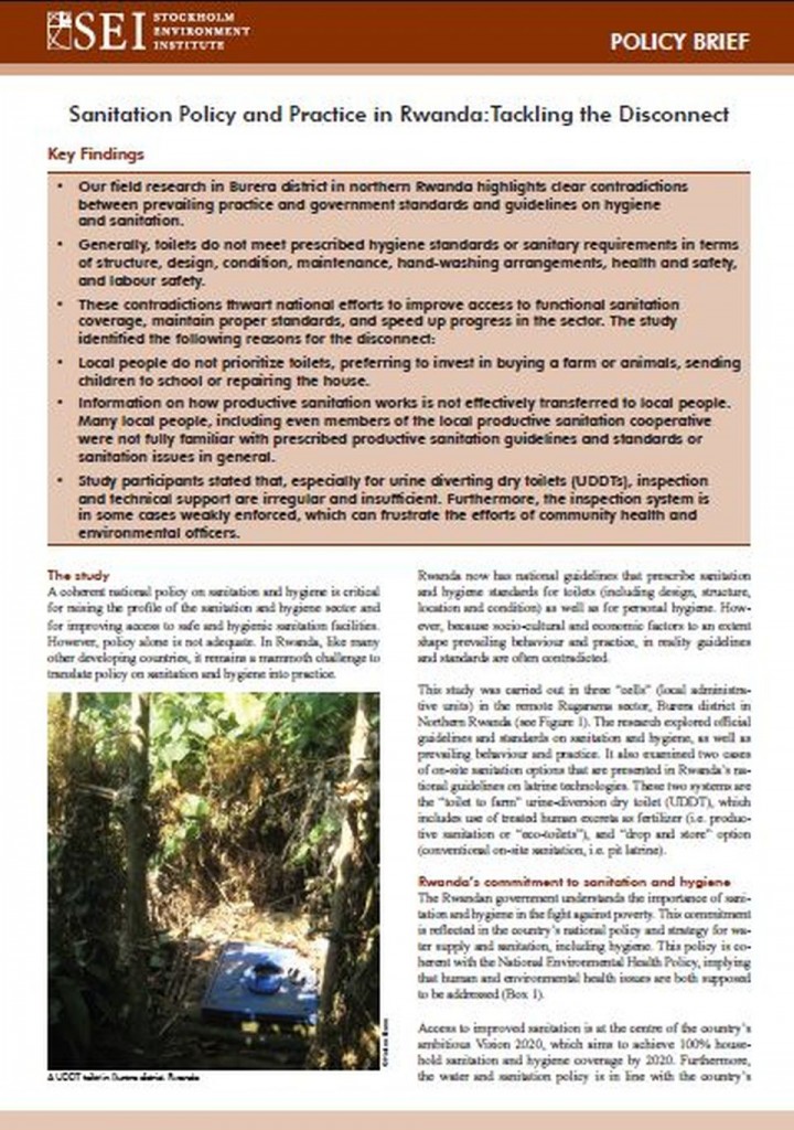 A coherent national policy on sanitation and hygiene is critical for raising the profile of the sanitation and hygiene sector and for improving access to safe and hygienic sanitation facilities. However, policy alone is not adequate. In Rwanda, like many other developing countries, it remains a mammoth challenge to translate policy on sanitation and hygiene into practice.