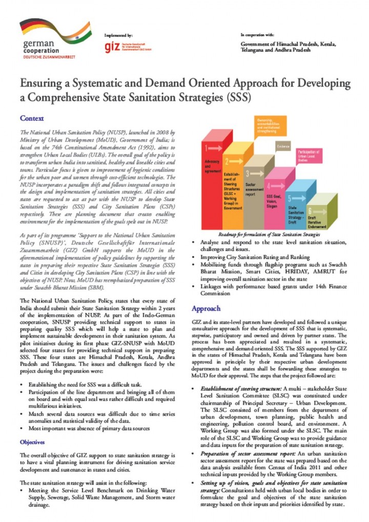 The National Urban Sanitation Policy (NUSP), launched in 2008 by Ministry of Urban Development (MoUD), Government of India; is based on the 74th Constitutional Amendment Act (1992), aims to strengthen Urban Local Bodies (ULBs). The overall goal of the policy is to transform urban India into sanitised, healthy and liveable cities and towns. Particular focus is given to improvement of hygienic …