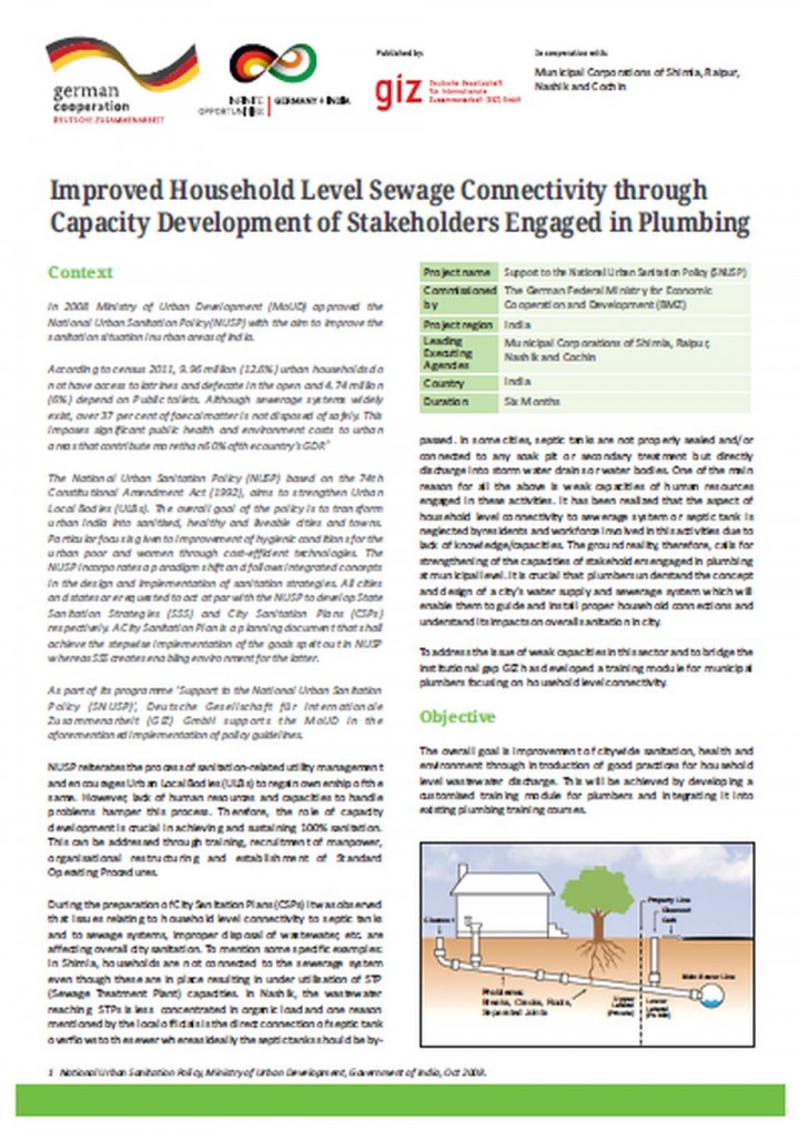 This publication summarizes the background, vision and sanitation policy issues in India that are adressed with the National Urban Sanitation Policy by the Ministry of Urban Development. It also provides draft frameworks, e.g. for City Sanitation Plans or developing state sanitation strategies.