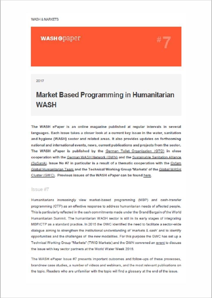 The WASH ePaper is an online magazine published at regular intervals in several languages. Each issue takes a closer look at a current key issue in the water, sanitation and hygiene (WASH) sector and related areas. It also provides updates on forthcoming national and international events, news, current publications and projects from the sector. The WASH ePaper is published by the German Toilet …