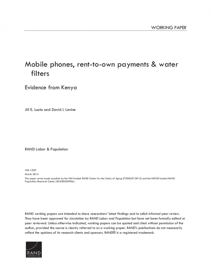 Uptake of safe water products remains low, in spite of modest cost. We experimented with a sales offer that combined a free trial and rent-to-own payments for durable filters. Purchase rates doubled under this sales offer to 31% compared to a traditional lump-sum sales contract. To lower transaction costs we collected payments using Kenya's vast mobile banking network, MPESA. Mobile repayment …
