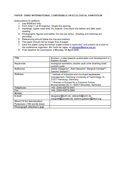 In this research, three faecal sludge sanitizing methods—lactic acid fermentation, urea treatment and lime treatment—were studied for application in emergency situations. These methods were investigated by undertaking small scale field trials with pit latrine sludge in Blantyre, Malawi. Hydrated lime was able to reduce the E. coli count in the sludge to below the detectable limit within 1 h …
