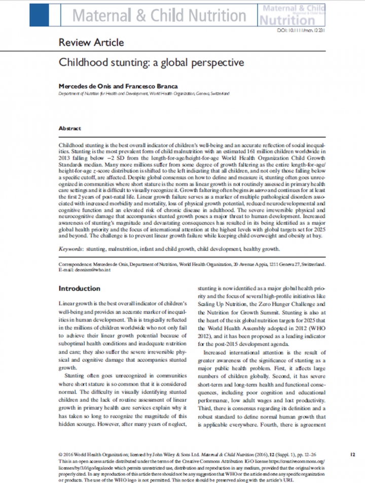 Childhood stunting is the best overall indicator of children’s well-being and an accurate reflection of social inequalities. Stunting is the most prevalent form of child malnutrition with an estimated 161 million children worldwide in 2013 falling below 2 SD from the length-for-age/height-for-age World Health Organization Child Growth Standards median. Many more millions suffer from some degree …