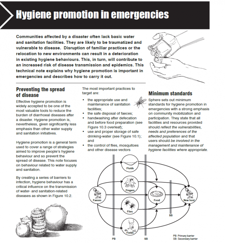 Communities affected by a disaster often lack basic water and sanitation facilities. They are likely to be traumatized and vulnerable to disease. Disruption of familiar practices or the relocation to new environments can result in a deterioration in existing hygiene behaviours. This, in turn, will contribute to an increased risk of disease transmission and epidemics. This technical note explains …