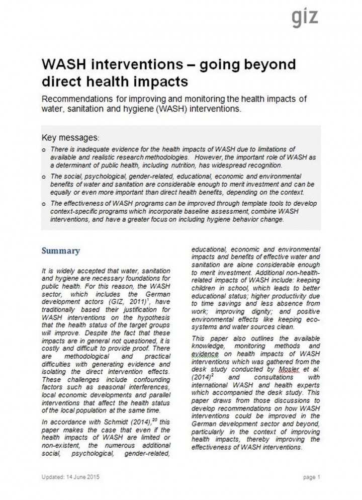 It is widely accepted that water, sanitation and hygiene are necessary foundations for public health. For this reason, the WASH sector, which includes the German development actors (GIZ, 2011), have traditionally based their justification for WASH interventions on the hypothesis that the health status of the target groups will improve. Despite the fact that these impacts are in general not …