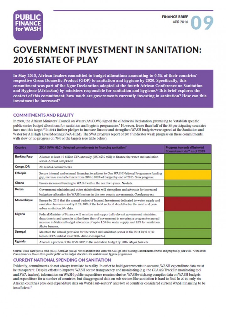 In May 2015, African leaders committed to budget allocations amounting to 0.5% of their countries’ respective Gross Domestic Product (GDP) to sanitation and hygiene by 2020. Specifically, this commitment was part of the Ngor Declaration adopted at the fourth African Conference on Sanitation and Hygiene (AfricaSan) by ministers responsible for sanitation and hygiene.1 This brief explores the …