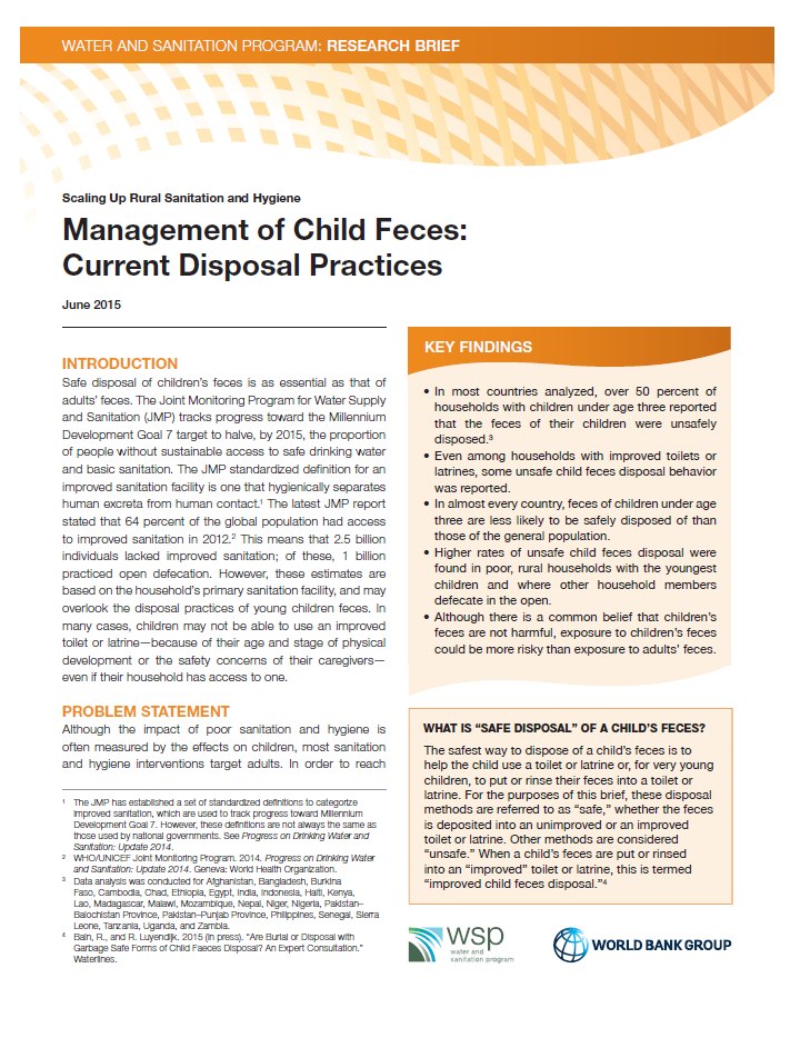 Safe disposal of children’s feces is as essential as that of adults’ feces. The Joint Monitoring Program for Water Supply and Sanitation (JMP) tracks progress toward the Millennium Development Goal 7 target to halve, by 2015, the proportion of people without sustainable access to safe drinking water and basic sanitation. The JMP standardized definition for an improved sanitation facility is …