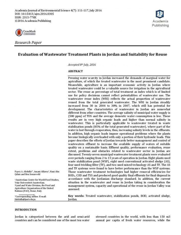 Pressing water scarcity in Jordan increased the demands of marginal water for agriculture, of which the treated wastewater is the most prominent candidate. Meanwhile, agriculture is an important economic activity in Jordan where treated wastewater could be a valuable source for irrigation in the agricultural sector. The reuse as percentage of total treatment as index which is of limited use for …