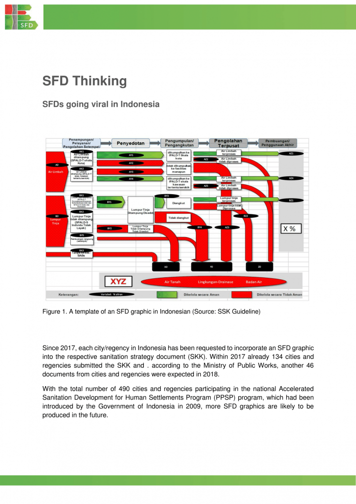 Since 2017, each city/regency in Indonesia has been requested to incorporate an SFD graphic into the respective sanitation strategy document (SKK). Within 2017 already 134 cities and regencies submitted the SKK and . according to the Ministry of Public Works, another 46 documents from cities and regencies were expected in 2018.