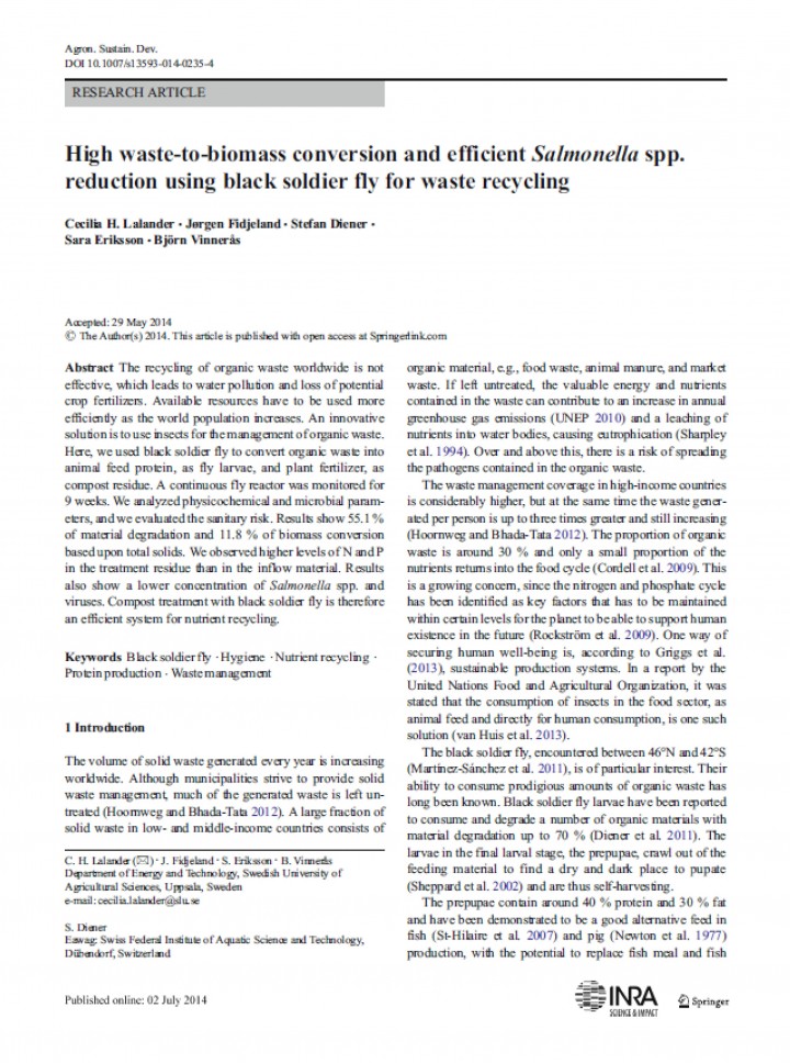The recycling of organic waste worldwide is not effective, which leads to water pollution and loss of potential crop fertilizers. Available resources have to be used more efficiently as the world population increases. An innovative solution is to use insects for the management of organic waste. Here, we used black soldier fly to convert organic waste into animal feed protein, as fly larvae, and …