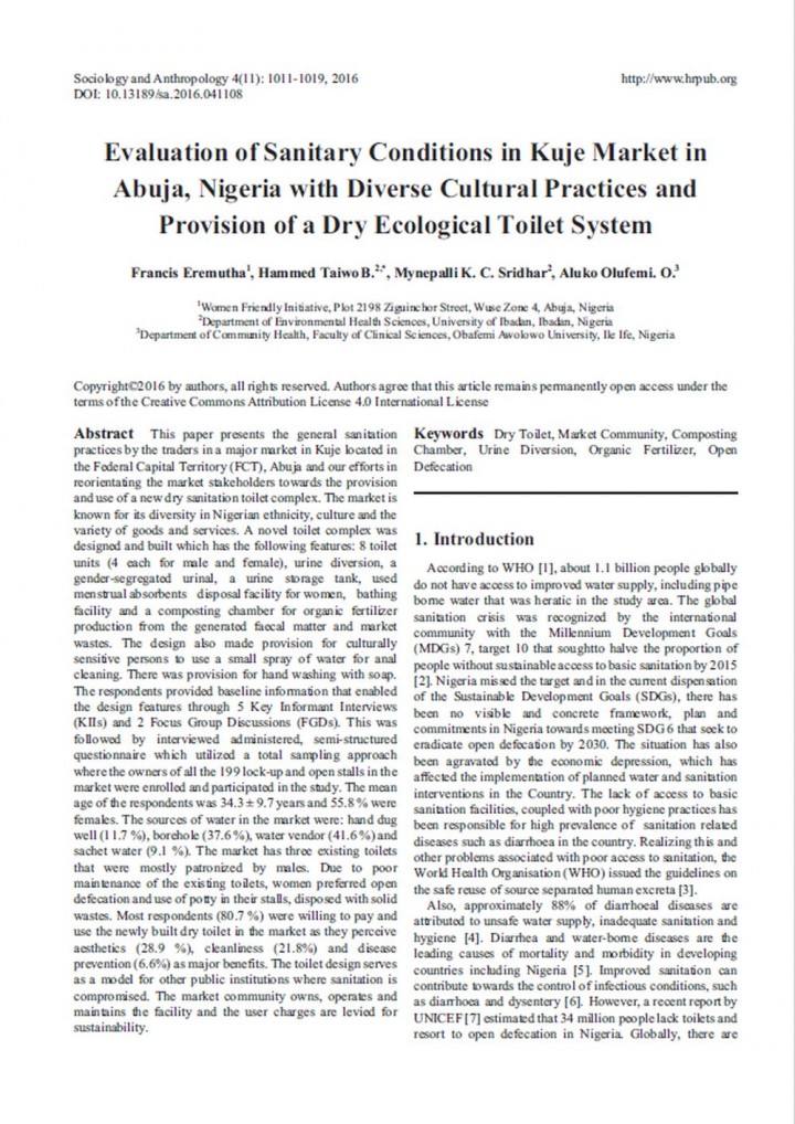 This paper presents the general sanitation practices by the traders in a major market in Kuje located in the Federal Capital Territory (FCT), Abuja and our efforts in reorientating the market stakeholders towards the provision and use of a new dry sanitation toilet complex. The market is known for its diversity in Nigerian ethnicity, culture and the variety of goods and services. A novel toilet …