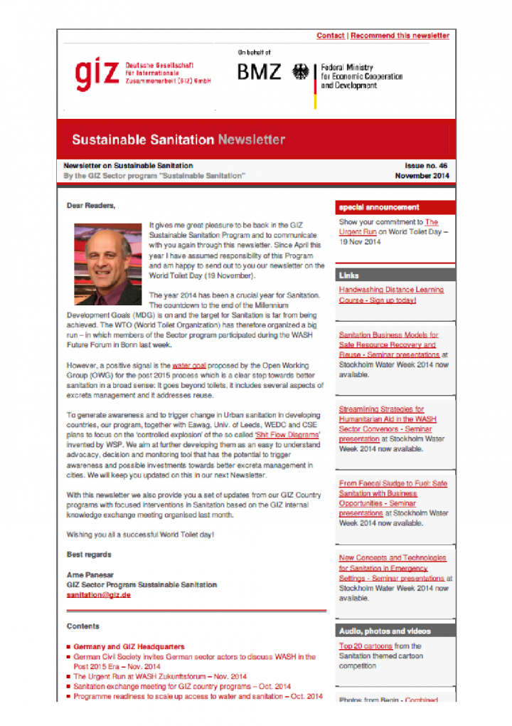 Archived newsletters of the regular electronic news bulletin from the sustainable sanitation projects. These newsletters were sent to subscribed members involved in initiatives and projects in the field of sanitation.