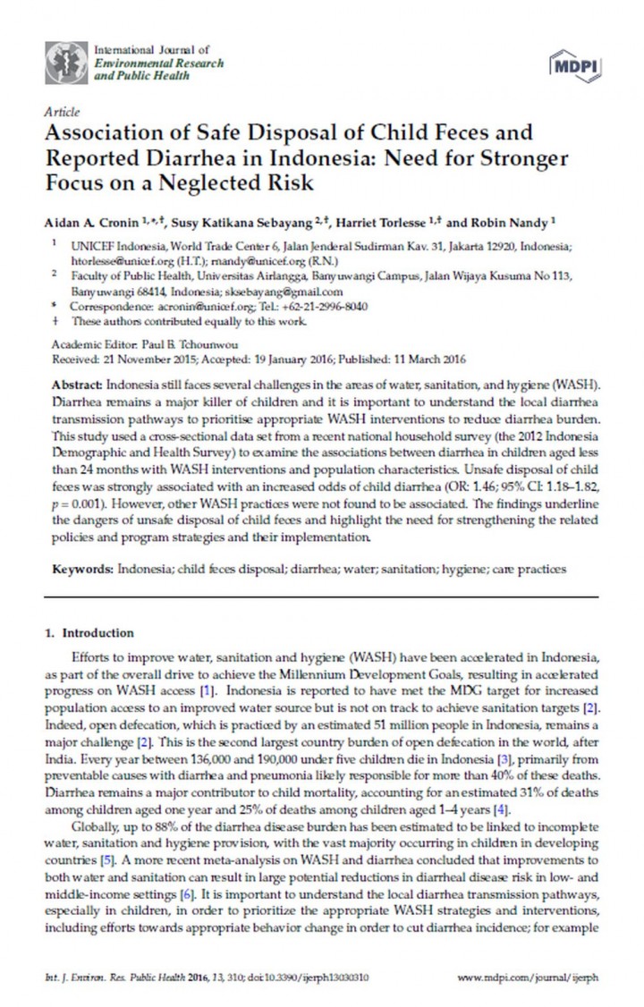 Indonesia still faces several challenges in the areas of water, sanitation, and hygiene (WASH). Diarrhea remains a major killer of children and it is important to understand the local diarrhea transmission pathways to prioritise appropriate WASH interventions to reduce diarrhea burden. This study used a cross-sectional data set from a recent national household survey (the 2012 Indonesia …