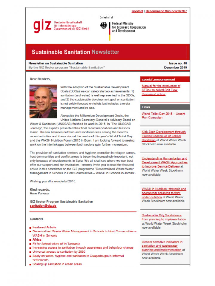 Archived newsletters of the regular electronic news bulletin from the sustainable sanitation projects. These newsletters were sent to subscribed members involved in initiatives and projects in the field of sanitation.