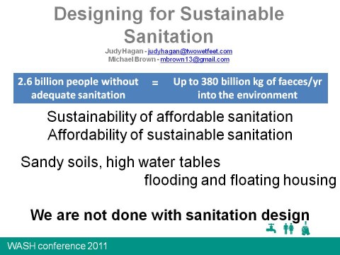 The presentation concludes that "Portaloo" is replicable for a short term period, if a treatment plant is available for safe disposal of the sludge and if the equipment is available in country. It should not also put focus on monitoring the trucks and “hot line” or complain mechanism for the users. The presentation was held at the WECD conference July 2011 in Loughborough, England.