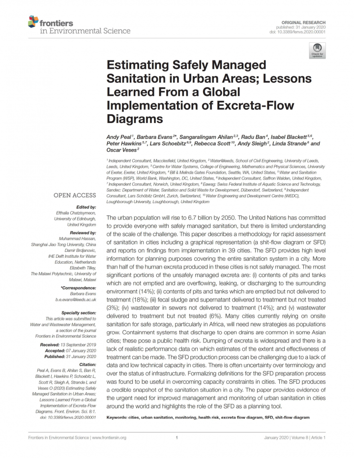This paper describes a methodology for rapid assessment of sanitation in cities including a graphical representation (a shit-flow diagram or SFD) and reports on findings from implementation in 39 cities. The SFD provides high level information for planning purposes covering the entire sanitation system in a city. More than half of the human excreta produced in these cities is not safely managed. …